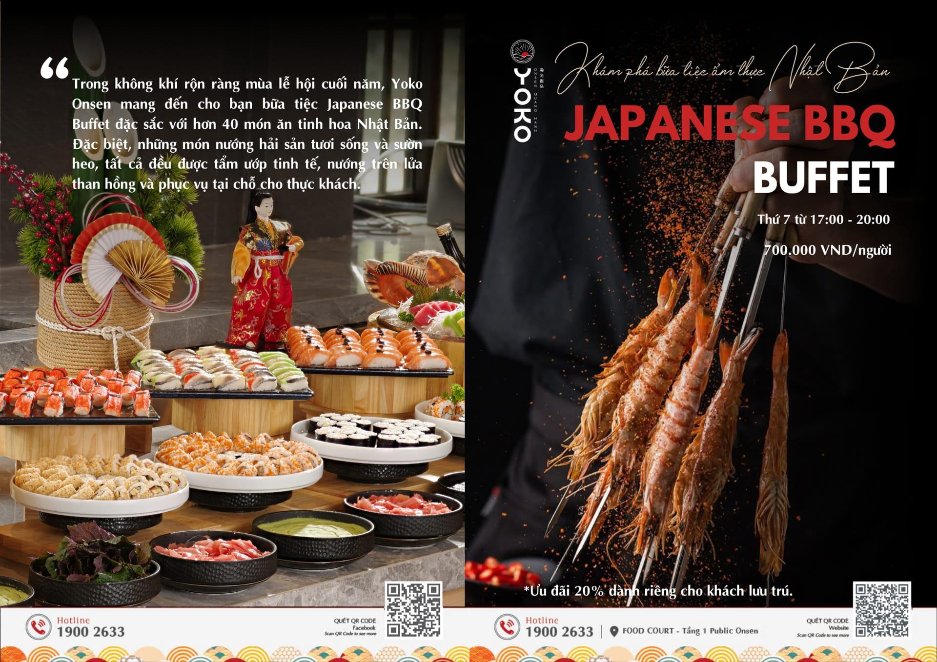 Nếu bạn là người yêu thích ẩm thực Nhật Bản, đặc biệt là sự kết hợp giữa truyền thống và hiện đại, thì Yoko Onsen Quang Hanh chính là điểm đến lý tưởng vào mỗi tối thứ 7. Trong không khí rộn ràng mùa lễ hội cuối năm, YOKO ONSEN mang đến cho bạn một trải nghiệm buffet đẳng cấp với sự hòa quyện của các món Nhật truyền thống và BBQ hải sản tươi ngon. Bên cạnh sự góp mặt của sushi, sashimi thượng hạn cùng những món ăn đặc trưng, YOKO phục vụ các món nướng từ hải sản tươi sống và sườn heo, tất cả đều được tẩm ướp tinh tế, nướng trên lửa than hồng và phục vụ tại chỗ cho thực khách.