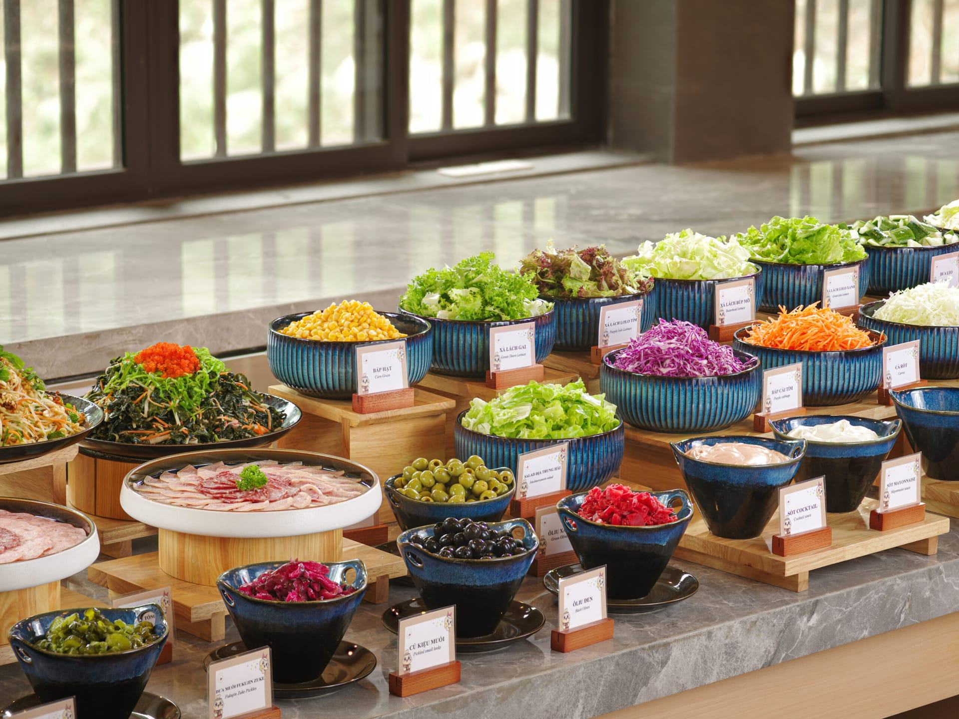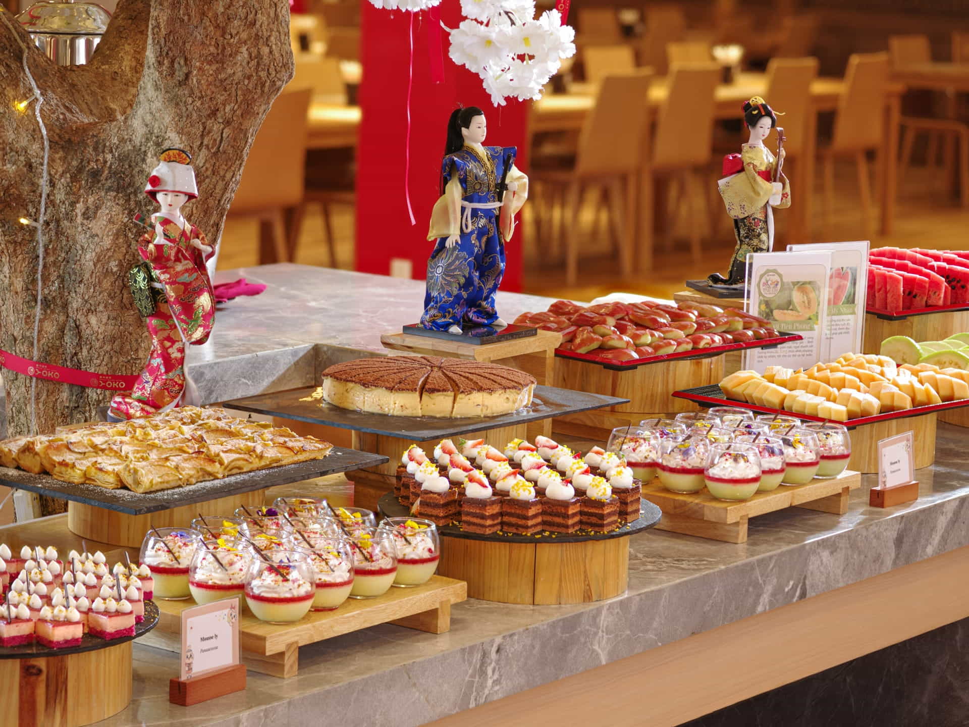Với gần 40 món ăn phong phú, buffet tại Yoko Onsen không chỉ giới thiệu những món ăn đặc trưng như sushi, sashimi mà còn bao gồm các món độc đáo như mỳ Ramen, các món truyền thống Nhật và các món tráng miệng hấp dẫn. Sushi và sashimi được chế biến từ hải sản tươi sống và trang trí đẹp mắt, thể hiện nghệ thuật ẩm thực Nhật Bản.